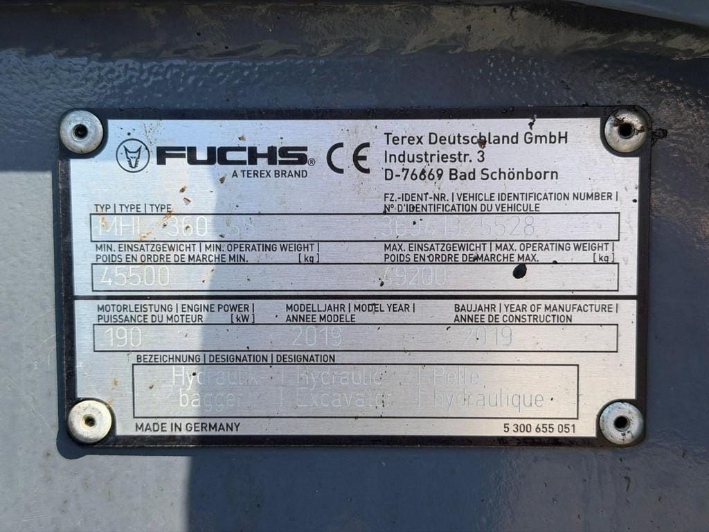 This Fuchs MHL 360 is a powerful material handler, built in 2019 and equipped with a 190 kW engine. With an operating weight of up to approximately 49 tons, this machine is perfectly suited for heavy-duty material handling applications in recycling, scrap, and bulk industries.